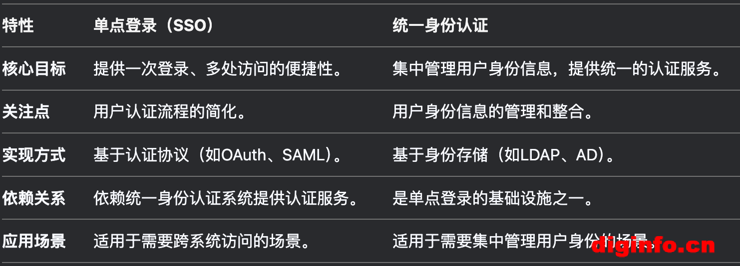 统一身份认证:关注用户身份信息的集中管理和统一认证服务。