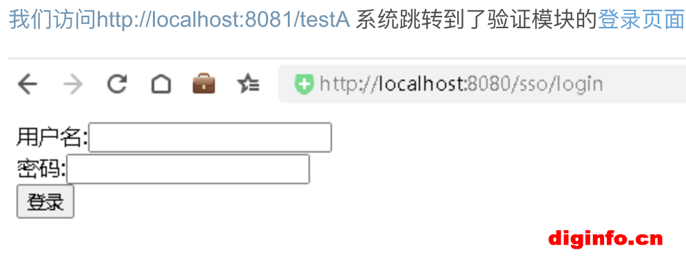 我们访问http://localhost:8081/testA 系统跳转到了验证模块的登录页面http://localhost:8080/sso/login