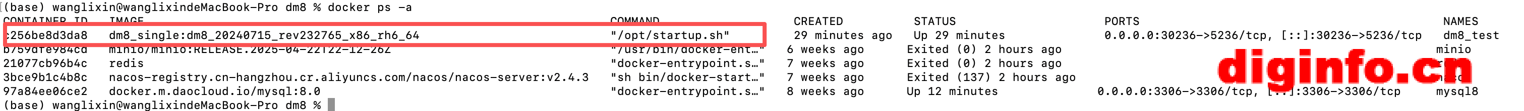 2)启动数据库,命令如下:docker start dm8_test
