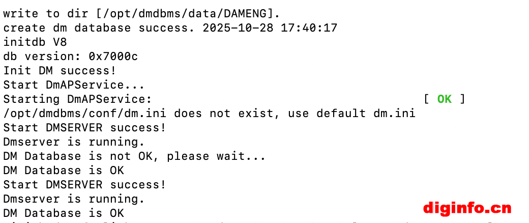 2)启动数据库,命令如下:docker start dm8_test
