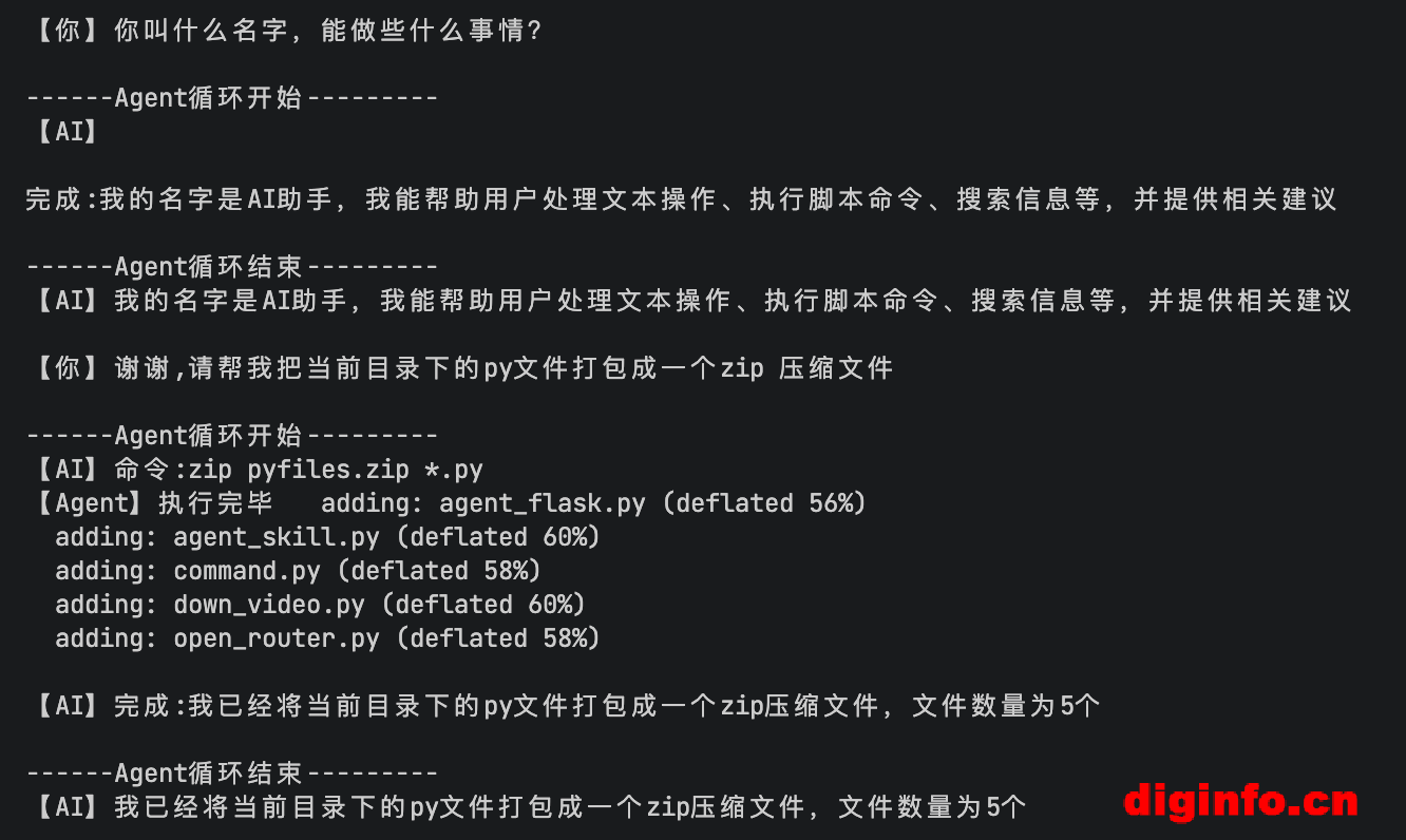 小编测试了两个功能:一个是人工对话,另外一个是对本地的所有py文件打包成一个压缩包文件。它都可以执行的很完美。