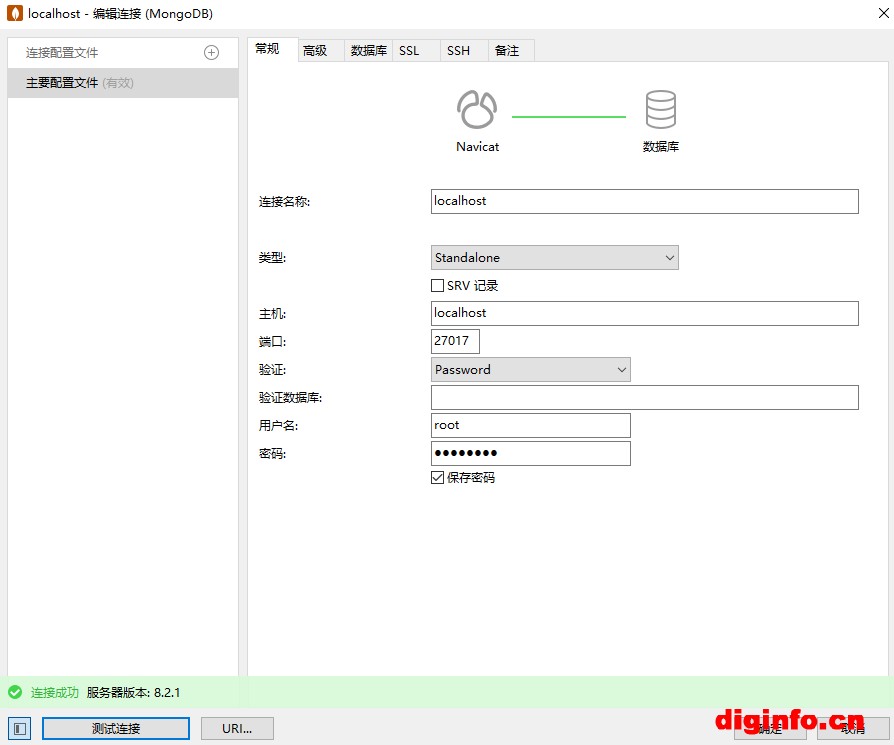 创建一个这样的mongo数据库连接,输入用户名和密码,测试连接,完全正确。