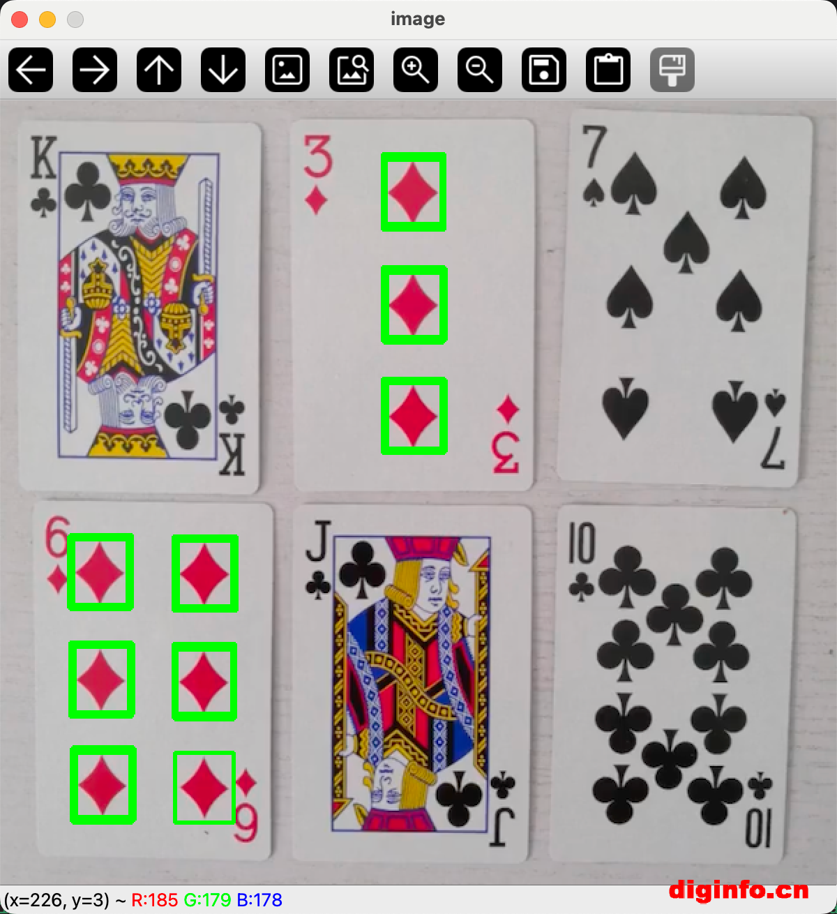 比如有这样的一张图片,上面有几张扑克牌,我们想找出所有的红色方片图案。