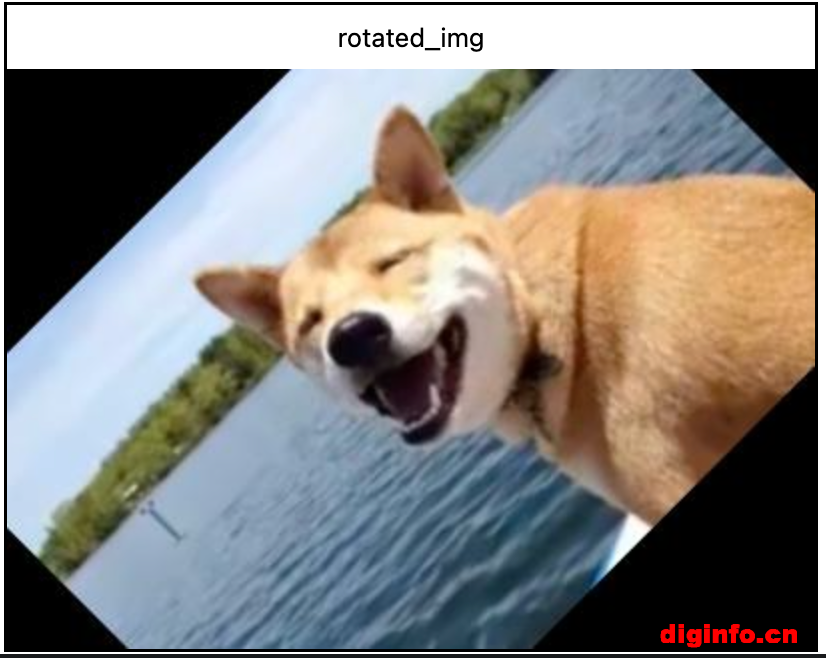 rotated_img = cv2.warpAffine(dog, M, (w, h))