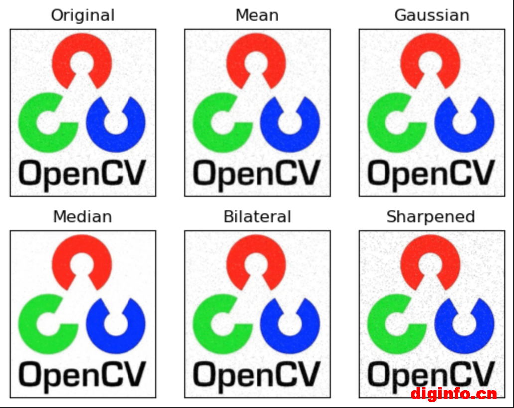 images = [img_rgb, blur, gaussian, median, bilateral, sharpened]